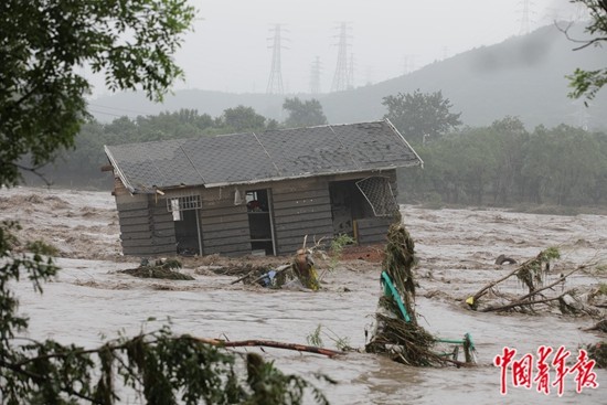8月1日,北京门头沟永定河,一间被洪水冲得倒斜的房屋。据附近的居民介绍,该房屋系绿化工人的临时休息地,屋内人员此前已经转移。中青报·中青网记者 陈剑/摄