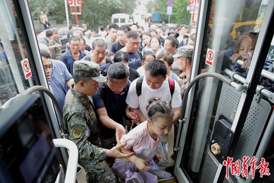 8月2日,北京市门头沟区妙峰山镇,一名武警战士正在帮助K396次列车滞留旅客登上大巴车。