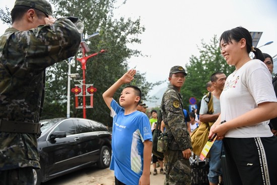 8月2日,在北京市门头沟区妙峰山镇,在乘坐车辆转移前,武天骐(中)向北京武警总队机动三支队的王雷鸣敬礼感谢。