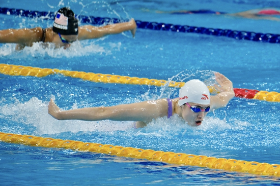 8月2日,成都大运会男女4×100米混合接力决赛,中国队张雨霏在比赛中。汪龙华/摄