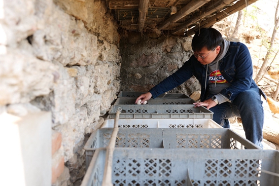 凡皓在帮村里的农户家捡拾鸡蛋。