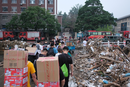 8月3日,北京市门头沟区王平镇,由于前方道路中断,车辆难以行进,北京京煤集团总医院、北京电力、北京联通等单位的数十名志愿者背负医疗用品、泡面、瓶装水等救援物资徒步前往10公里外的大台街道支援当地受灾群众。中青报·中青网见习记者 田嘉硕/摄