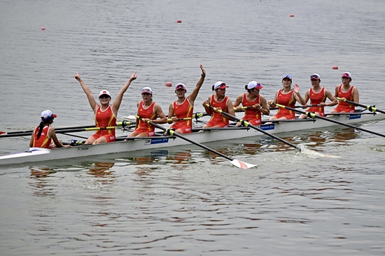 8月6日,在成都大运会女子八人单桨有舵手决赛中,由鞠汶君、夏珂珂、赵旋伊、闻嘉奕、张书贤、赵星月、王子凤、吴伊慧、宋佳怿组成的中国队获得金牌。视觉中国供图