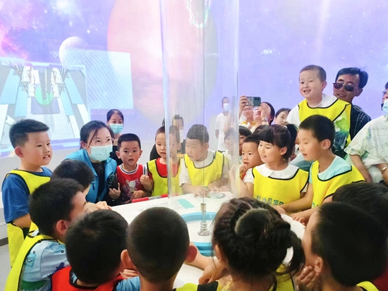 6月16日,宁夏回族自治区吴忠市盐池县科技馆,讲解员周惠向盐池县第四幼儿园学生演示展品“一飞冲天”。盐池县科技馆供图