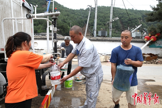 8月6日,北京市门头沟区妙峰山镇担礼村,水务部门的工作人员金池(中)帮助村民接水。金池介绍,他每天要开两趟水罐车来到这里给当地的灾民送水,每趟会带来11吨左右的饮用水。中青报·中青网记者 陈剑/摄