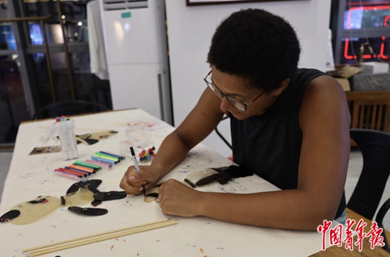 外国选手在成都大运村互动体验中心体验为皮影上色。中青报·中青网记者 毕若旭/摄