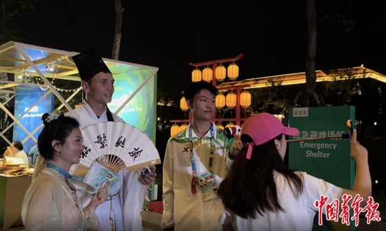 8月4日晚的大运村文化集市上,亚历山大·布拉特无疑是最引人注目的“显眼包”。这位身高超过190厘米、高鼻梁深眼窝的摩尔多瓦赛艇运动员头戴黑色东坡帽,身穿一袭白色宽袖长袍,手摇一把折扇,款步走在充满中国风的文化集市街头,遇到有人向他打招呼时,他还会回以刚刚学会的抱拳礼。每天从赛场回到大运村后,他都会和中国志愿者一起到村里的文化体验中心和集市上逛逛,体验书法、年画、中国功夫等中国传统文化。