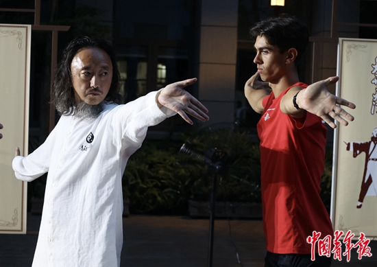 青城派掌门刘绥滨为前来体验太极的德国运动员做示范。中青报·中青网记者 毕若旭/摄