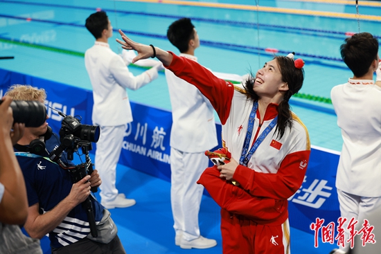 8月7日,成都大运会游泳项目最后一个比赛日上,张雨霏赢得女子50米自由泳金牌后,将小礼物扔向观众席。中青报·中青网记者 曲俊燕/摄