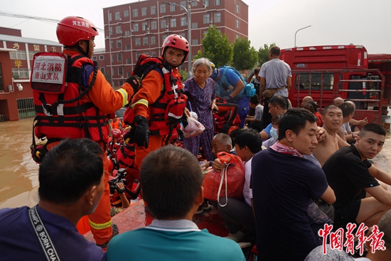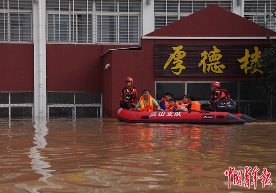 8月3日上午,河北涿州刁窝镇,河北省唐山市消防救援支队的青年消防员驾驶冲锋舟进入学校救援受困群众。中青报·中青网记者 李峥苨/摄