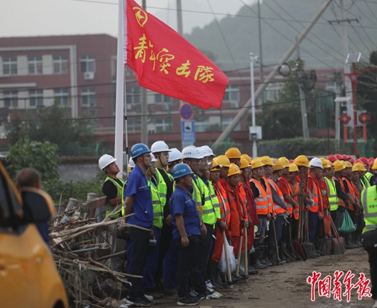 8月2日,位于北京市门头沟区妙峰山镇,铁路部门的青年突击队队员在抢修上工前,集合整队。据悉,为了线路早日恢复,铁路部门组织多方力量,轮班作业,昼夜不停。中青报·中青网记者 陈剑/摄