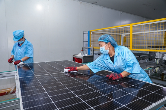 2023年8月1日,浙江湖州,在南浔区练市镇的浙江美尚光伏有限公司车间内,工人在赶制发往海外的光伏板。视觉中国供图