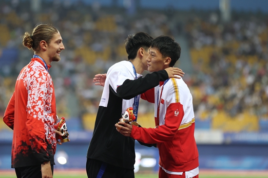 8月4日,成都大运会男子400米跨栏决赛,中国台北队选手彭名扬以48秒62的成绩夺冠,中国队选手谢智宇以48秒78的成绩获得季军。图为谢智宇(右)与彭名扬(中)在颁奖仪式上拥抱。视觉中国供图