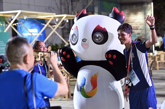 8月4日晚,成都大运会吉祥物“蓉宝”走进成都大运村,与“村民”欢乐互动。成都大运会期间,大运村内举办大量文化交流和体验活动,吸引“村民”参与。图为参赛运动员在大运村与“蓉宝”合影。视觉中国供图