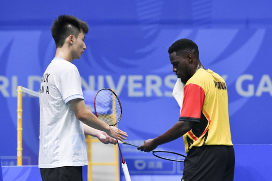 大运会羽毛球比赛中,乌干达球员阿莫斯的球拍线打断,但由于他没有备用球拍,使比赛被迫暂停。这时,中国球员王正行将自己的备用球拍借给乌干达球员,保证比赛顺利进行。视觉中国供图