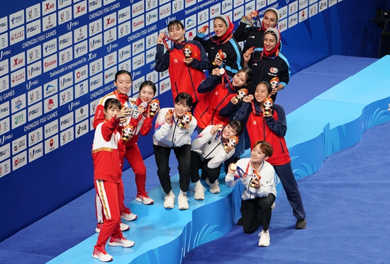 7月30日,成都大运会跆拳道项目,刘雨青、梁婕、李婉获得女子团体品势银牌,颁奖仪式后,该项目所有获奖选手一起合影。视觉中国供图