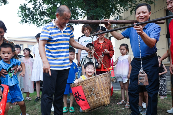 8月8日,村民在姚家村文化礼堂前用传统方式给孩子们称体重。当日,浙江省湖州市长兴县画溪街道在姚家村文化礼堂开展“多彩民俗迎立秋”主题活动,通过“瓜上雕刻”、“啃秋”吃西瓜、悬秤称重等趣味活动,让孩子们体验传统民俗,了解节气的相关知识。新华社记者 徐昱/摄