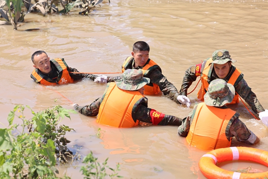 北部战区陆军第78集团军某旅组织官兵在黑龙江哈尔滨市双城区万隆乡增产村封堵管涌(8月10日摄)。宁春瑞/摄(新华社发)