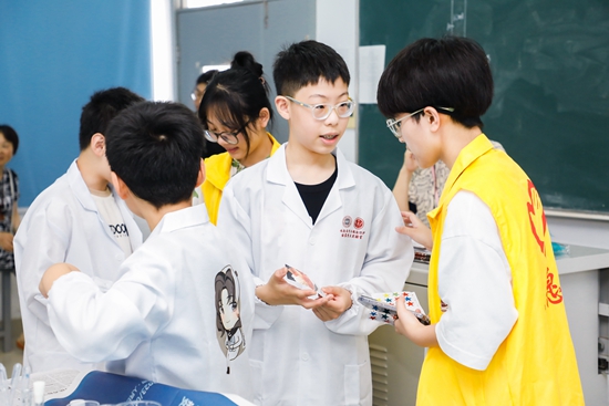 苏州大学“核星起航”核科普志愿服务团带领来自63所学校的中小学生参观了苏州大学放射医学与辐射防护国家重点实验室科普展厅,并带领中小学生一起做实验。苏州大学供图