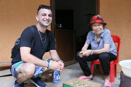 海南大学“强国有我,青春有为”实践队赴雨林中的五指山市毛纳村和海口市施茶村调研。图为实践团留学生成员与黎族老人攀谈。海南大学供图