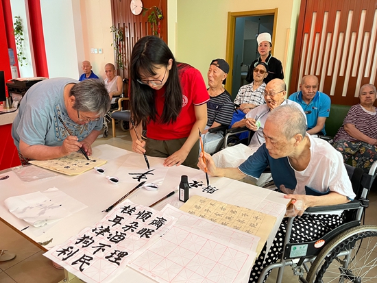 天津商业大学生物技术与食品科学学院“津味青年”实践队在天津市西青区退役军人养老院与老人交流。天津商业大学供图