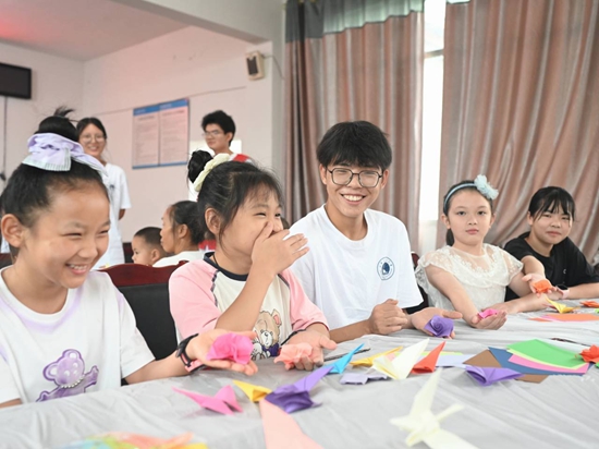 成都理工大学产业技术学院“齐心协荔,宜泸生花”发展成就观察团在泸州市合江县柿子田村带小朋友们折纸。成都理工大学供图