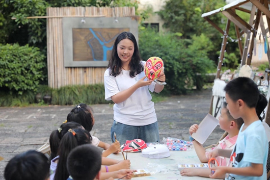浙江艺术职业学院手工艺学院“守艺工坊”暑期社会实践团队成员在绍兴大禹开元观堂教孩子们画脸谱。浙江艺术职业学院供图