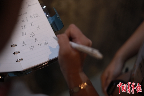 7月24日,塔吉克斯坦青年和体育委员会人事部首席专家马欣博努·赛菲迪诺娃在笔记本上练习写“中国”。中青报·中青网见习记者 傅瑞/摄