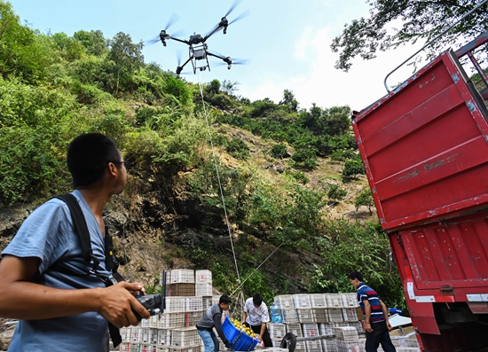 长期以来,该县从果园到公路主干道的柑橘转运主要靠人力,转运效率低、成本高。近年来,该县根据山区特点,探索安装果园轨道运输机、架设空中索道、使用无人机等方式,提升柑橘转运效率,助力果农增收。郑家裕/摄(新华社发)