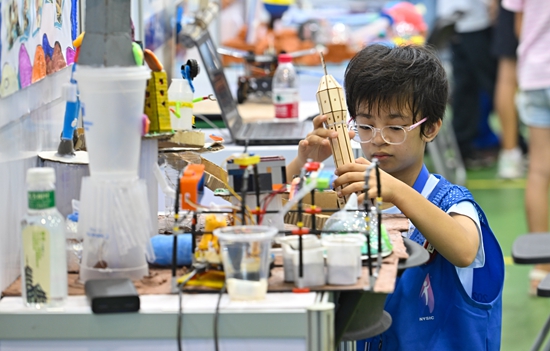 当日,以“仰望星空 成就梦想”为主题的2023年全国青少年航天创新大赛总决赛在海南省文昌市开幕,来自全国25个赛区的近3000名参赛选手,围绕航天创意设计、太空探测、航天科学探究与创新3个竞赛单元及载人航天主题专项赛展开为期3天的角逐。新华社记者 郭程/摄