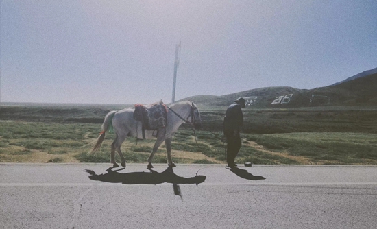 在青海省海北藏族自治州,一位牧民牵着马前行。王楚为/摄