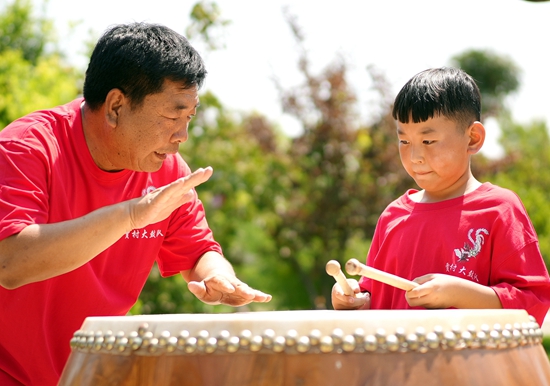 8月14日,在河北省沧州市沧县旧州镇贾村,大鼓艺人指导学生练习贾村大鼓。暑假期间,河北省沧州市沧县组织中小学生开展武术、木板大鼓等非遗项目学习活动,让学生在学习传统文化的同时,度过一个丰富多彩的暑假。新华社记者 骆学峰/摄