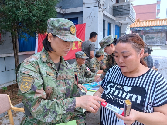 来到索大爷家,周武红先给他仔细量了血压,又用听诊器检查心脏,老人的血压、脉搏都很正常。索大爷一下见到这么多穿着军装的年轻人,开心地笑了:“你们能来我特别高兴,看到你们受灾群众就看到了希望。”