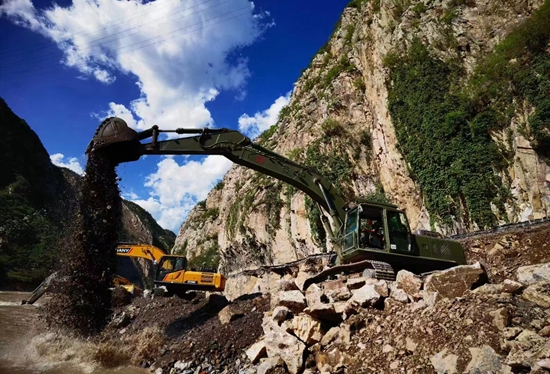 8月16日,在北京门头沟王平镇,武警第一机动总队某支队百余名官兵,驾驶大型工程机械,正在全力投入打通各村进村道路工作;