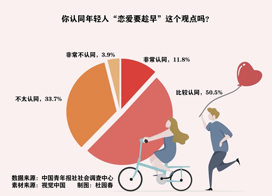 日前,中国青年报社社会调查中心联合问卷网(wenjuan.com),对2004名单身青年进行的一项调查显示,62.3%的受访青年认同年轻人“恋爱要趁早”,受访男性和95后认同度相对更高。56.1%的受访青年认为早点走进恋爱关系有助于建立对爱和两性的基本认知,懂得相处之道,46.9%的受访青年觉得能更清楚什么样的人适合自己。