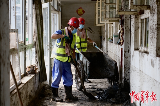 8月17日,北京市房山区河北镇东庄子村,北京市青年突击队的两名队员在一户居民家中进行清淤工作。由团北京市委牵头、团房山区委对接、8家在京企业组建的北京市青年突击队前往受灾严重的房山区河北镇东庄子村开展为期10天的清淤重建工作,重点对村内公共设施、学校以及困难户家中进行清淤清扫和消杀。中青报·中青网见习记者 田嘉硕/摄