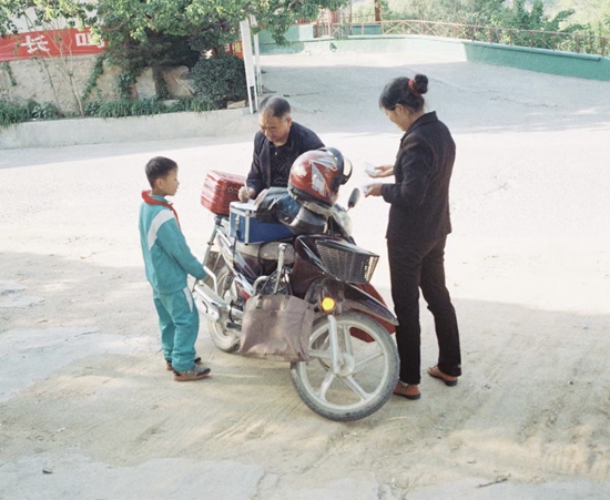 赵奎发站在摩托车旁为路上偶遇的患者开药。