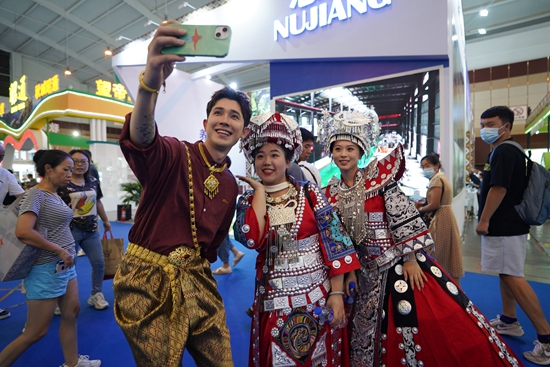 身着民族服装的年轻人在第七届中国-南亚博览会上拍照留念(8月17日摄)。