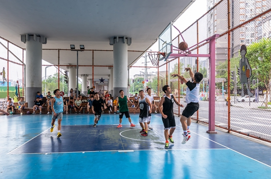 2022年6月12日,年轻人在成都市府青路立交下的运动空间打篮球。杜宁/摄(新华社发)