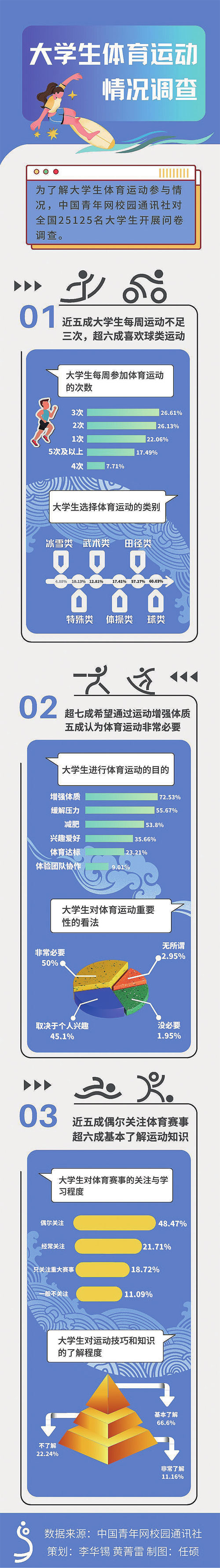 大学生积极参与体育运动是促进身心健康发展的重要方式。体育运动可以促进健康、缓解压力和改善心理状况,培养团队合作能力和竞争意识。近五成大学生每周运动不足三次,这一数据值得关注。加强大学生体育运动刻不容缓。