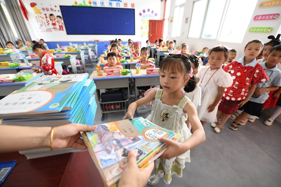 8月21日,学生在贵州省黔东南苗族侗族自治州黄平县新州镇中心小学领取新课本。当日,贵州各地中小学迎来2023年秋季学期开学第一天。王超/摄(新华社发)