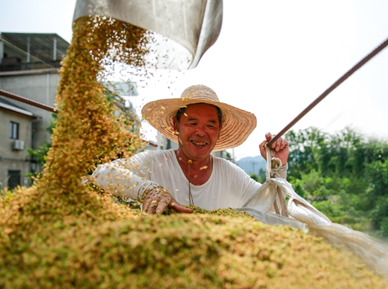 8月21日,杭州市淳安县汾口镇仙居村村民们洋溢着笑容,收获着“再生稻”。视觉中国供图