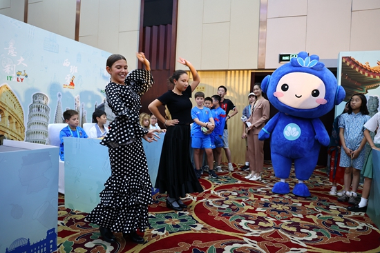 来自法国的艾瑞卡·贝勒和中国女孩尚逸菲在活动现场分别表演了代表自己国家文化的舞蹈。艾瑞卡身着代表法国服饰风格的海魂衫和贝雷帽,她表演的是法国传统的体育庆祝类舞蹈,尚逸菲则身着唐代齐胸裙演绎了中国古典剑舞。