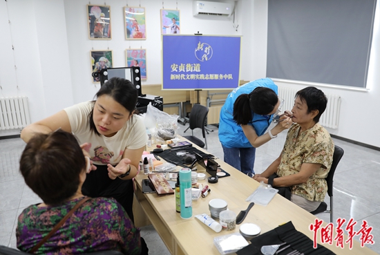 8月21日,北京市朝阳区安贞街道党群服务中心,志愿者为准备拍照的老人们化妆。8月21日-22日,主题为“情暖七夕,爱在夕阳”的七夕公益婚纱摄影活动在这里举行。中青报·中青网记者 陈剑/摄