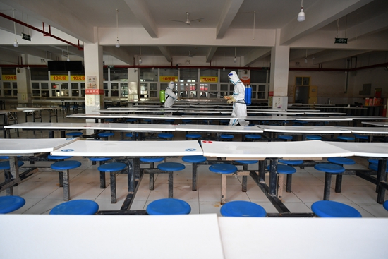 8月16日,河北涿州,暴雨灾害后,双塔中学的老师在学校食堂进行环境消杀,确保秋季学期如期开学。翟羽佳/摄 视觉中国供图