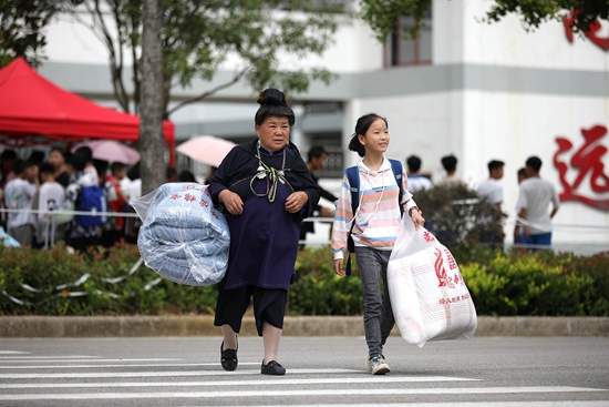 8月21日,贵州黔东南丹寨县第二中学学生拿着行李返校。视觉中国供图