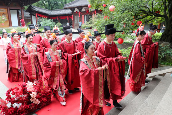 8月22日,8对新人身着婚庆礼服在福建省武夷山市参加武夷宫春秋馆举行的“朱子婚礼”。