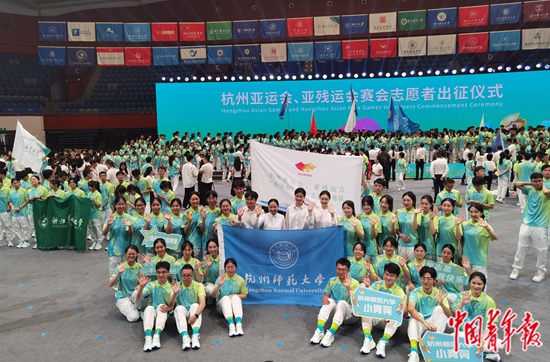 8月24日,浙江杭州,浙江大学紫金港校区体育馆,在杭州亚运会、亚残运会赛会志愿者出征仪式后,赛会志愿者们合影留念。中青报·中青网记者 蒋雨彤/摄