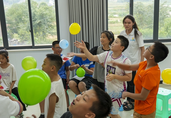 8月24日,在重庆市九龙坡区新民村村委会活动室内,孩子们在心理咨询师志愿者的指导下进行互动小游戏。