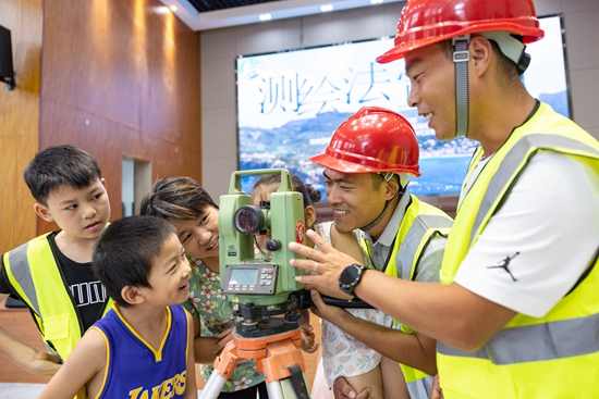 8月28日,浙江湖州和平镇,测绘员正利用测绘仪器向小朋友讲解测绘测量知识。